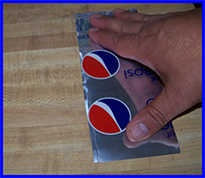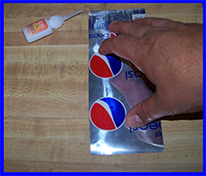 To glue a panel of cans, start by placing your first can on a flat surface with the print side up as shown in the picture. While you are holding it flat, take your super glue and make a line of beaded super glue from the top of your can to the bottom as shown.