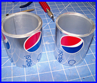 pair of scissors rather than attempting to cut them with a hand tool such a Dremel. As shown on the picture to the right, I lay the can on its side, poke the Hobby knife blade into the can and rotate it as I cut until the bottom comes off. I repeat this with the top of the can until only the middle part remains. I then make a vertical cut through the can on the seam of the can which is usually easy to find near the nutrition facts. The last step is to cut off the edge of the cans at the top and the bottom about 1/8th of an inch to remove the access material from cutting the top and bottom off. When completed, your cans should look like mine below. Notice that the edges are completely smooth and the frayed edge has been cut off on both ends: