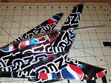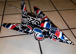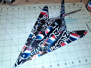 The completed Fiddler’s Green F-117 Nighthawk built out of Coke Zero cans