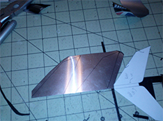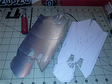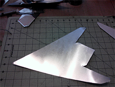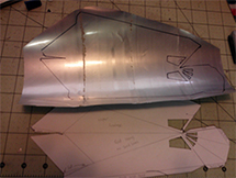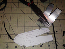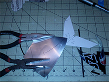 - To make the tail assembly, first use the template provided (cut off the fold over sections) to trace out a top and bottom piece out of can material and as shown in the picture below. Also trace out two corresponding pieces out of the aluminum sheeting material to reinforce your tail assembly as shown.