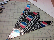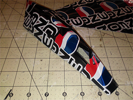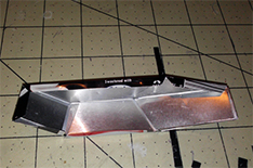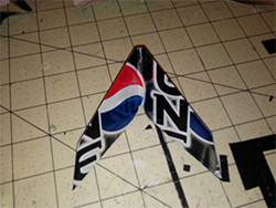 - To make the unique nose piece of this aircraft use the template provided to trace the piece onto your can material. To create the piece, first use a straight edge to fold the piece lengthwise, and then fold the four tabs inward until your nose piece looks as shown to the pictures below.