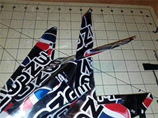 - Once the assembly is dry, you will need to take a straight edge and carefully bend the assembly as shown in the picture below since the F-117 has a unique twin tail that angles upward slightly. Once this step is completed it is now ready to be mounted to the top of your upper fuselage piece
