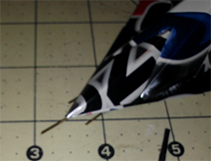 - Align and test fit your nose piece so that it sits flush on the lower fuselage surface, upper fuselage and is centered as well. The final position is indicated in the picture below. When you have the nose piece aligned properly, glue it into position as shown.